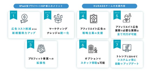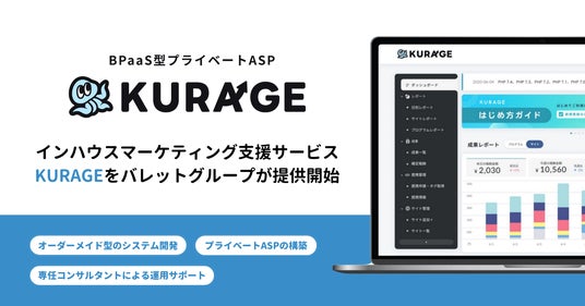 「KURAGE」はアフィリエイターと直接つながることのできる、BPaaS型プライベートASPサービスです。10年以上広告運用を行ってきたバレットグループの技術基盤と独自ノウハウを組み合わせた、最適なサポートを提供します。