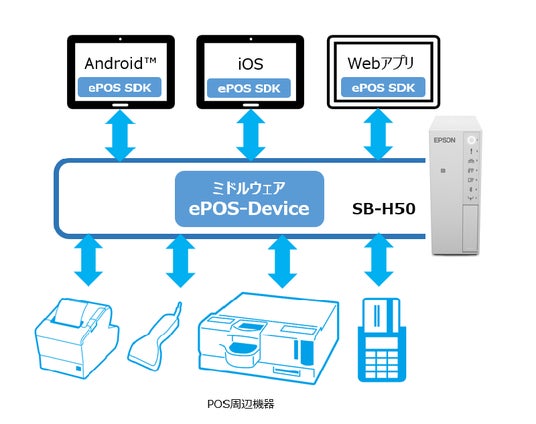 『SB-H50』に搭載されている「ePOS-Device」はエプソン独自の周辺機器連携テクノロジーです。AndroidTM、iOS(iPadOS)、Webブラウザーに実装されたアプリケーションとPOS周辺機器との連動を可能にします。また、無償提供の開発キット「ePOS SDK」により、開発が容易となります。