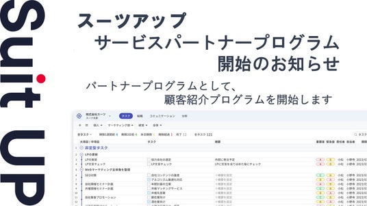 株式会社スーツ(所在地:東京都千代田区、代表取締役社長CEO:小松 裕介)は、チームでかんたん、毎日続けられるプロジェクト・タスク管理ツールの経営支援クラウド「Suit UP」(スーツアップ)において、パートナープログラムの一つとして、お客様にスーツアップをご紹介いただくサービスパートナープログラムを開始いたします。