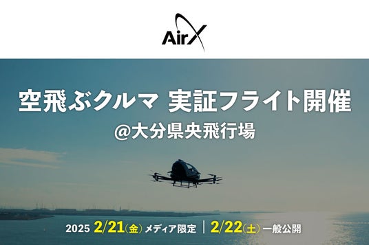 株式会社AirX(本社:東京都千代田区、代表取締役:手塚 究、以下「AirX」)は、2025年2月22日(土)に大分県央飛行場(所在地:大分県豊後大野市)にて、空飛ぶクルマの実証フライトを実施することをお知らせいたします。また空を身近に感じていただけるイベントも同日に開催いたします。