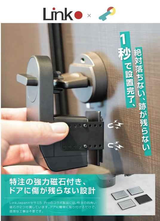 本製品は、簡易設置型スマートロック製品で主に採用されている「両面テープ固定」の課題であった、「賃貸住宅等、退去時に原状回復が必要な環境でドアを傷つけてしまう恐れがある」といった問題を解決する為に、当社がSESAMEロック専用の強力磁石を開発した国内唯一(※)のスマートロックです