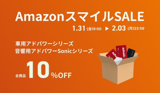 1月31日(金)9:00 ~ 2月3日(月)23:59まで開催の第2回AmazonスマイルSALEにて、自動車用アドパワーシリーズ、音響用アドパワーシリーズ全品10%OFFを実施しております。