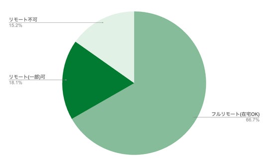 Apex言語案件におけるリモートワークの採用状況を分析すると、フルリモートで働ける案件が66.7%と圧倒的多数を占めています。一部リモート可能な案件が18.1%、完全出社が必要な案件は15.2%に留まっており、全体の84.8%の案件で何らかの形でリモートワークが認められています。この傾向は、Apex言語開発におけるリモートワークの高い親和性と、企業側の柔軟な働き方への適応を示しています。