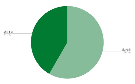 Apex言語案件における稼働日数の分布を見ると、週2~3日の勤務形態が58.3%と過半数を占めています。一方、従来型の週4~5日勤務は41.7%となっており、フレキシブルな働き方が主流となっていることがわかります。このデータからは、Apex言語エンジニアの間で、ワークライフバランスを重視した柔軟な勤務形態が広く受け入れられていることが見て取れます。