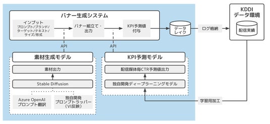 本システムは、KDDIが定めるブランドガイドラインや、auブランドを感じていただくための表現手法を定義した「au VISUAL IDENTITY(注1)」に遵守した広告クリエイティブ(バナー画像)を半自動で生成した後、過去の広告配信実績に基づき、広告効果の高いクリエイティブを自動で選別することができるシステムです。このたび、本システムのβ版をKDDIのデジタルマーケティングおよび広告業務に試験導入することで、関連業務の工数を50%削減できることを確認しました。