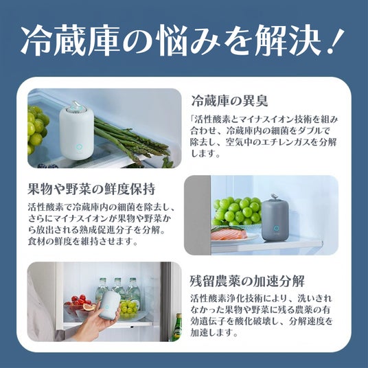 周囲を酸化させる「活性酸素」と、「マイナスイオン」を組み合わせることで、冷蔵庫内のニオイ分子を分解し、除菌効果も発揮します。