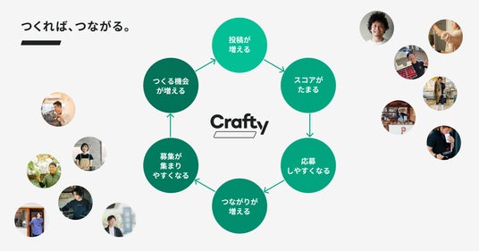 Craftyは、仕事や趣味でものづくりする職人やクリエイターが、日々の制作物を投稿することで新たな仕事仲間と出会うためのポートフォリオを作成できる、ビジネスSNSです。