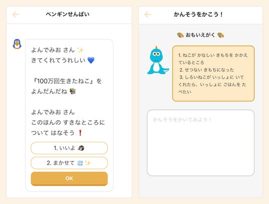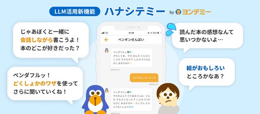 「ハナシテミー」は、ヨンデミーに新たに追加された機能で、AIによるキャラクターとの会話を通じて、本の感想文を作成できるサービスです。対話を重ねることで、子どもたちが自然に読み方の技法を身につけられるようサポートし、表現力や読解力の向上を目指します。