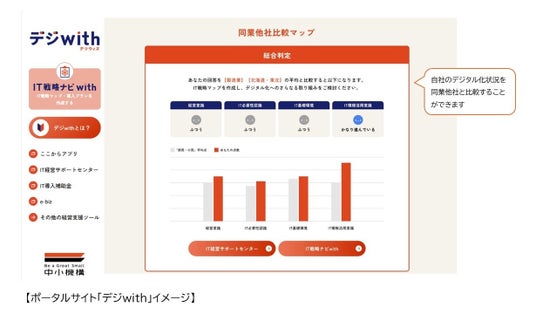 事業者のデジタル化を後押しするためのポータルサイト。事業者のデジタル化の状況を同業他社と比較することが可能です。経営の悩みを解決するためのITソリューションを提案する「IT戦略ナビwith」、具体的な業務用アプリやIT導入事例を探せる「ここからアプリ」、ITの専門家へ気軽にオンラインで無料相談できる「IT経営サポートセンター」など、様々なメニューで事業者のデジタル化をサポートします。