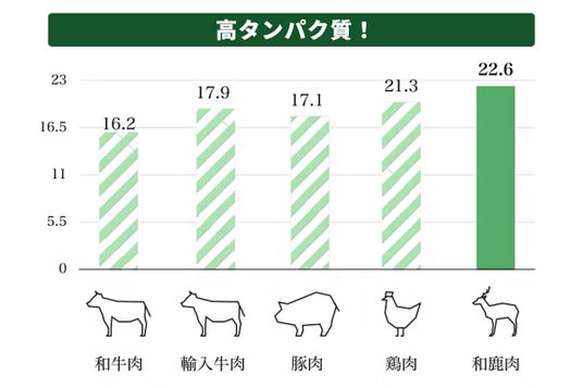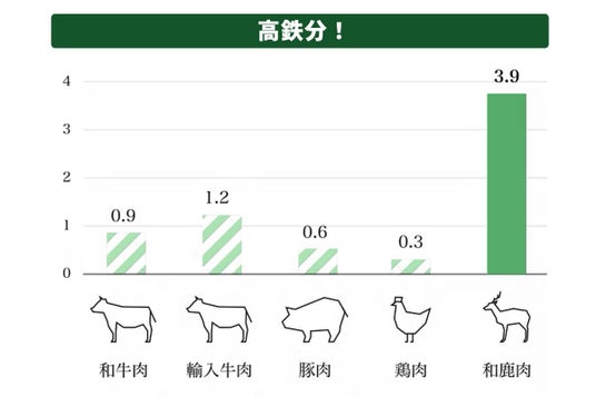 鉄分豊富な野菜「ほうれん草」100gには吸収率5%の非ヘム鉄が2.0mg含まれ、体内に吸収される鉄分は0.1mg。鹿肉100gには吸収率30%のヘム鉄が3.9mg含まれ、体内に吸収される鉄分が約1.2mg=成人1日の鉄分摂取量(推奨)に相当します。なんと!鹿肉100g=ほうれん草1.2kg相当分です。