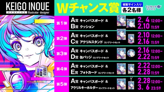 2025年2月4日(火)より『ケイゴイノウエ/KEIGO INOUE』のオンラインくじを、「くじラックオンライン」で販売いたします。さらに、くじ1枚ご購入ごとにWチャンス賞の抽選が行われ、当選した方は特別な賞品が獲得できます。