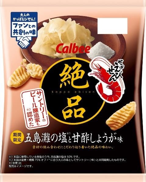 商品の特徴:『絶品かっぱえびせん 五島灘の塩と甘酢しょうが味』は、こだわりの塩として、海の恵みである「にがり」をほどよく含んだカドのないまろやかな深い味わいが特徴の“五島灘の塩”を使用。塩で引き立つ素材に、お寿司屋さんのガリの味をイメージした、「かっぱえびせん」と相性の良い酸味のある甘酢しょうがの味わいを表現。すっきりとした味わいの「金麦<糖質75%オフ>※2」とも合うよう、しょうがの辛みはあえて控えめにし、世代を問わず好まれるベストな組み合わせを追求しました。お酒のおともとしてはもちろん、「かっぱえびせん」が好きな方に特に楽しんでいただきたい、今までにありそうでなかった共創品ならではの味わいです。