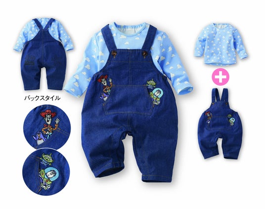 刺しゅうがアクセントのオーバーオール、ジャンスカとTシャツのセット。