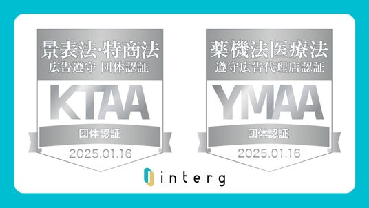 デジタルメディアの運営などを手掛けるインターグ株式会社(本社:東京都港区、代表取締役社長:那須 剛、以下、インターグ)は、一般社団法人薬機法医療法規格協会(本社:東京都中央区、理事長:寺垣俊介)が提供する、薬機法・医療法・景品表示法・特定商取引法について遵法に広告を行っている事業者を認証する制度「KTAA(景表法・特商法遵守広告代理店認証)」「YMAA(薬機法医療法遵守広告代理店認証)」のシルバー団体認証マークを取得しました。