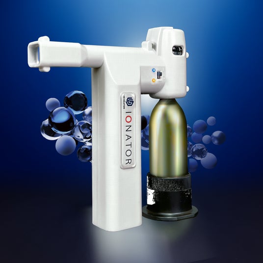 高純度窒素の小型カートリッジボンベと電池駆動が可能なイオナイザーモジュールを組み合わせ、最適構造設計により効率的にマイナスイオンを被写体にあて(指向角約35度)、対象物の除電・除塵が可能。