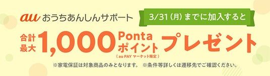 当社が2024年度において推進している不正対策強化の取り組みに加えて、お持ちの家電や今後ご購入の家電が5年間保証される家電保証をよりおトクにご利用いただけるよう、KDDIが提供する「auおうちあんしんサポート」に新規入会のお客さまを対象に、最大1,000Pontaポイント(au PAY マーケット限定)を還元する「au おうちあんしんサポート入会キャンペーン」を2025年2月1日から実施します。