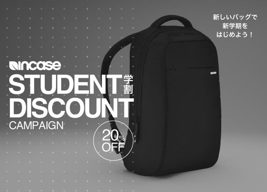 また、Incaseオフィシャルオンラインストアでは、学生証のお写真を送っていただくと 20% OFFにてお買い物いただけるクーポンコードを発行いたします。