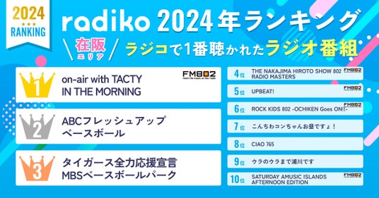 株式会社radikoが発表した、2024 年ラジコで聴かれたラジオ番組・音楽を振り返る年間ランキングにおいて、在阪エリアのラジコで一番聞かれたラジオ番組ランキングで、FM802 「on-air with TACTY IN THE MORNING」(月-木 06:00-11:00 DJ大抜卓人)がトップとなりました。