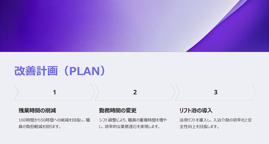 この取り組みでは、残業時間を100時間から50時間に削減し、介護職員の負担を軽減することを目標とした。具体的には、勤務時間を調整して職員同士が重なる時間を確保し、効率的な入浴対応を可能にする。また、浴用リフトを導入し動線や作業負担を見直すことで、入浴支援の効率化を図った。さらに、介護職員に対してアンケートを実施し身体的・精神的負担の変化を測定した。
