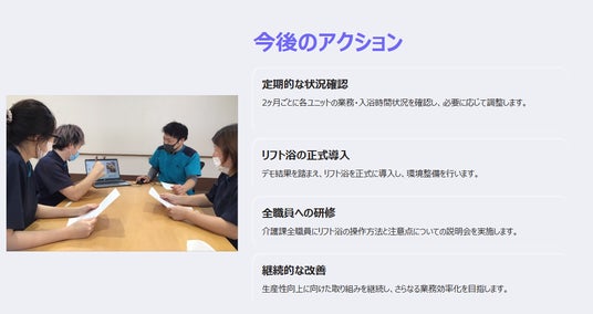 また、ICTやIoTの活用による書類作成の効率化など、業務全体のさらなる改善が期待される。文字起こしアプリやAIツールを活用することで、資料作成の負担を減らし、職員が入浴支援以外の業務にも集中できる環境を整えていくことが必要だ。さらに、職員のスキルアップを目指して取り組みを継続するとともに、取り組みの成果をグループ全体で広め、他施設でも同様の効果を生むための仕組み作りを進めていきたい。