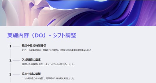 早番を6:30~15:30から7:00~16:00と、遅番を13:00~22:00から12:00~21:00に変更し、職員の勤務時間が1時間半なるように調整した。これにより、入浴支援がよりスムーズに行えるようになり、職員間の協力体制が強化された。また、シフト自動作成ソフトを活用して事前に配置人数を確認し、柔軟なシフト運営を実現した。