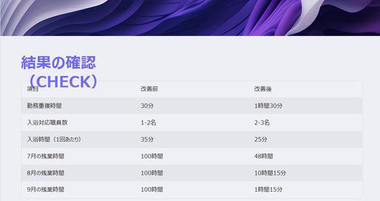 今回の取り組みでは、「時間はないものではなく、つくるもの」という意識のもと、アナログとデジタル両方の側面から効率化に挑戦をすることで、効率的な業務改善を実現した。勤務時間の見直しによって生じた余裕が、入浴支援の質向上と職員のワークライフバランスの確立につながった。さらに、勤務時間の調整と浴用リフトの導入によって入浴に関する残業時間を大幅に削減し、介護職員の身体的・精神的負担を軽減した点も重要である。これにより、業務効率化とご利用者満足度向上を両立し、安全で安心な入浴環境を提供できるようになった。