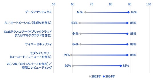 ●過去24ヵ月間にテクノロジーのすべてのカテゴリーで、平均87%の組織がテクノロジーを利用して利益を増大させました。2023年と2024年の両年で調査の対象となったカテゴリーでは、これらのシステムが自社の収益性にプラスの影響を与えてきたと回答した上級管理職の数が、前年比で25%増加しました。