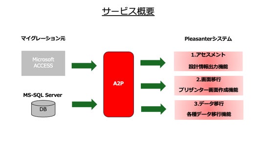 本サービスは、今までラモテクが手掛けた多様なシステムからPleasanterへの移行実績で培ったノウハウを活用し、さらにAccessからPleasanterへの専用マイグレーションツール(A2P)を新たに開発し駆使することで、マイグレーションのコストと工期を大幅な削減を実現します。