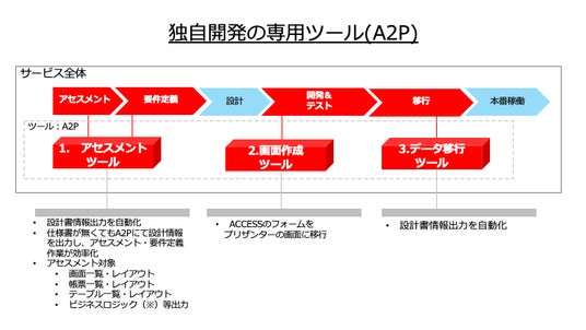 アセスメント、画面作成、データ移行の工程別に3種類の専用ツールを利用