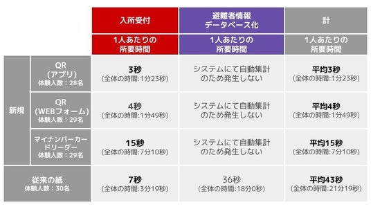 アプリからQRを読み取る経路では、入所受付から避難者情報データベース化まで平均3秒で完了し、従来の方法の14分の1以下の所要時間と最も短いことがわかった。次いで、今回から新たに追加された、QRを読み取りWEBフォームに入力する経路にて平均4秒という結果になった。この読み取り方法は、これまでの実証実験にて、アプリのインストールと事前登録が一定のITリテラシーを求める経路であることが判明したために、追加されることとなった。アプリからのQR 読み取りに比べて1人あたり1秒劣るものの、アプリインストールと事前登録・認証が不要となり、これらの手順に慣れていない方も容易に利用できることから、有事のように様々な人が利用する場面でより時間短縮が期待できる。