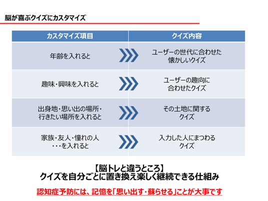 「株式会社THE QUIZ TEAMでは、現在、リアル桃太郎電鉄福岡市地下鉄編やクイズアプリ「くまモンヒーローズ」、さらには企業のチームビルディング向けクイズアプリなどを展開していますが、この度、位置情報を抜いたクイズアプリ単体をグレードアップさせ、認知症アプリを制作しております。