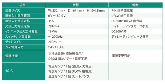最大DC800Vの高電圧に対応しており、海外のAC400V系の電力系統や定格400Vのモータにも対応可能です。さらに、SiCデバイスならではの高いスイッチング周波数での運転が可能であり、SiCデバイスを前提とした次世代のパワーエレクトロニクス開発に最適です。
