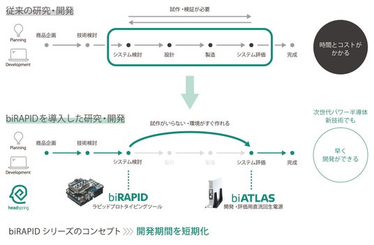 ヘッドスプリングでは、開発期間の短縮を実現するためのラピッド・プロトタイピング・ツール「biRAPIDシリーズ」を提供してきました。biRAPIDシリーズの製品群を組み合わせることで、試作開発時にハードウェア設計・製作の大部分を省略し、製品開発に要する時間と費用を大幅に削減することが可能です。ヘッドスプリングでは自社の開発プロジェクトにもbiRAPIDシリーズを積極的に活用しており、これまでに累計400件以上のパワーエレクトロニクス分野の先端開発を推進してきた実績があります。