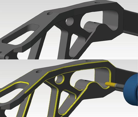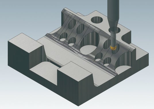 自動エッジ検出と直感的なインターフェースにより、手作業では難しい裏側のエッジ・傾斜穴に対しても均一にバリが取れるツールパスを作成します。ボールエンドミル・キャンディミル・ラジアスエンドミル・あり溝工具など、さまざまな工具を選択でき、工具の進入方向の設定や一筆書きのツールパスを作成します。Mastercam 2025から、Mill・Mill 3Dでも使用可能です(オプション)。