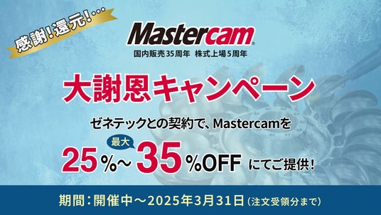 株式会社ゼネテック(本社:東京都新宿区、代表取締役社長:上野 憲二)は、「Mastercam国内販売35周年・株式上場5周年」を記念し、2025年3月31日までの期間限定で、弊社との契約でMastercamを最大35%OFFで提供する謝恩キャンペーンを実施しています。