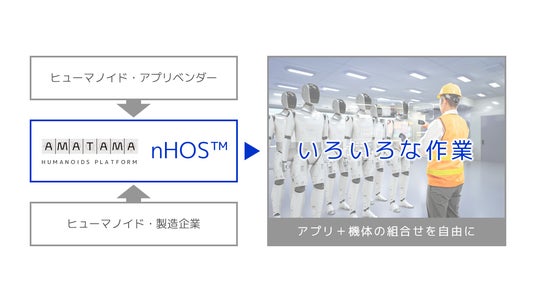 AMATAMAはこれらのヒューマノイドを第1世代としており、さらに機能を人間に近づけた次世代ヒューマノイドが2028年あたりに需要が高まることを見越して事業を進めています。次世代ヒューマノイドは、スマートフォンのように複数のAIアルゴリズムが組み合わされたアプリケーション・サービスと、身体機能を標準化したテクノロジー・ガイドラインのプラットフォームが必要とされると予測しており、そのサービス&テクノロジー・プラットフォーム【nHOS(TM)】を提供すべく事業を進めています。