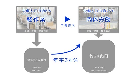 現在、主にシリコンバレーと中国ではヒューマノイドの開発競争とそれに対する投資が加速しています。これらのヒューマノイドは2028年ごろから倉庫や工場での軽量荷物の運搬や警備の見回りなど、人間の軽作業を置き換える用途で普及していくと予想されており、2030年には約5兆4千6百億円(forbs)、2035年には24兆円(Goldman Sachs)の市場が登場すると予想されています。