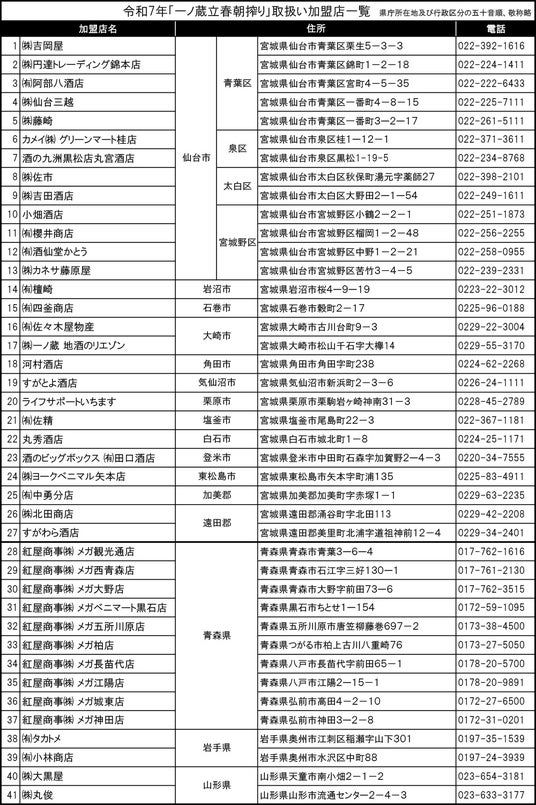 取扱店リスト:令和7年一ノ蔵立春朝搾り買えるお店はこちら(pdfダウンロード)