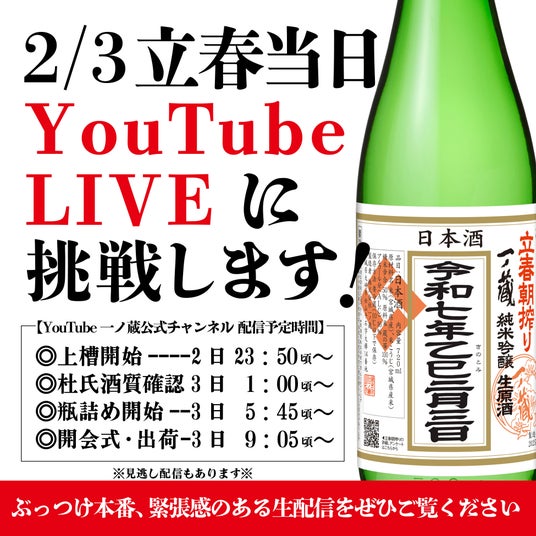 2月3日は立春。二十四節気の始まりの日で暦の上では春を迎え、その立春を祝うお酒が立春朝搾り。株式会社一ノ蔵(宮城県大崎市松山、代表取締役社長 鈴木 整)は、2月3日の立春に一ノ蔵立春朝搾り(※1)を発売する。立春当日の午前零時から始まるお酒の搾り作業から瓶詰め、出荷までの模様を4部構成でYouTube生配信を行う。一ノ蔵総杜氏 門脇による酒質の説明もリアルタイムでお聞きいただける。当日の生配信ならではの製造各所のリアルタイムの動き、臨場感をお楽しみいただきたい。