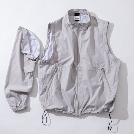 ジャケットは撥水性を備えたコットンタッチ素材を使用し、裏地には通気性の高いメッシュを採用。重ね着をしても快適な着心地を追求しました。袖が取り外せるコンバーチブル仕様により、ジャケットとしてもベストとしても着用可能な2WAYデザインが特徴です。ベストのシルエットにもこだわり、繰り返し試着を重ねてバランスを調整し完成させました。さらに、フロントポケットに収納可能なパッカブル仕様で、持ち運びに便利な設計となっています。