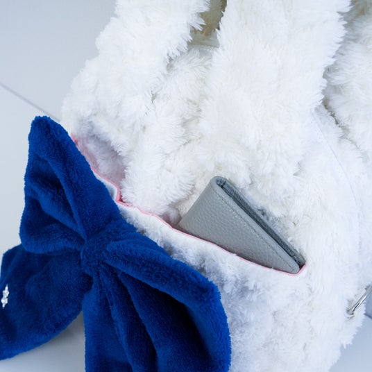 「モフモフまるバッグ」背面には大きな青いリボン(取り外し可)