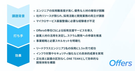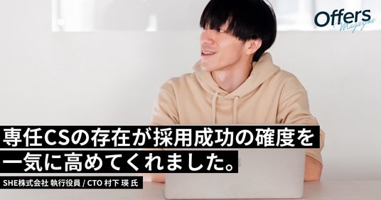 SHE株式会社では、エンジニア採用の効率化に向けてOffers専任CSメンバーと密接に連携。執行役員CTOの村下瑛氏のビジョンを正確に理解したCSメンバーが、候補者の選定から面談調整、スカウト文面の作成までを一貫してサポートし、採用難易度の高いリードクラス2名の採用にわずか1ヶ月半で成功。マイクロサービス化を推進する同社における、専任CSとの効果的な協業体制と採用プロセスの最適化について詳しくご紹介しています。