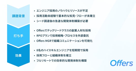 overflowはハイクラスエンジニア採用プラットフォーム「Offers」の強みを活かし、800社を超える採用支援実績で培った知見をもとに、RPOサービスのさらなる進化を追求してまいります。人材不足が深刻化する中、企業の「攻めの採用戦略」を実現するパートナーとして、引き続きサービス品質の向上に努めてまいります。