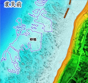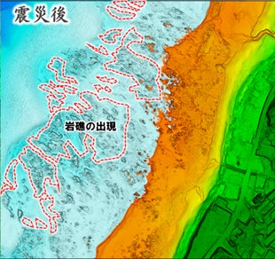 また、海底の地形については、単に全体的に一様に隆起しただけでなく堆積物が大きく移動していることが確認され、これにより大きな地形の変化も確認できました。堆積物の移動については、津波、または地震後の水深の変化にともなう波浪の影響によって発生したと考えられ、新たな岩場が出現しているような場所もありました。