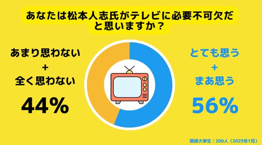 一方、松本人志氏に関して同じ内容で質問したところ、56%の学生が松本氏をテレビに不可欠だと回答しました。理由としては、