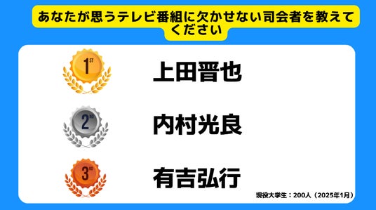 最後に、Z世代にとってテレビに欠かせない司会者を聞いたところ、くりぃむしちゅーの上田氏が1位となりました。