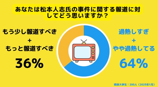 こちらも同様に松本人志氏で同様の質問をしたところ、64%が松本氏に関する報道を加熱しすぎと回答しました。