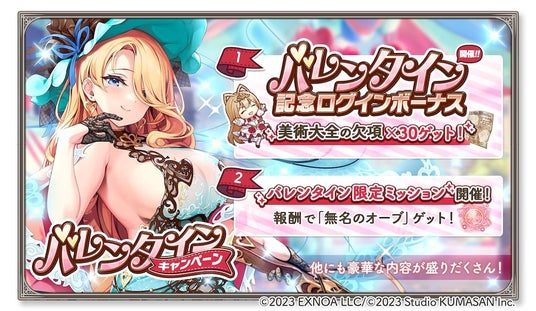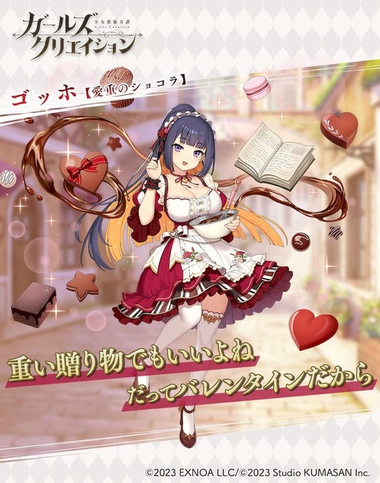 合同会社EXNOA(本社:東京都港区、CEO:村中 悠介、URL:https://games.dmm.com/)が運営するDMM GAMESにおいて、「クリエイティブチーム くまさん」第4弾作品となる『ガールズクリエイション -少女藝術綺譚-』(以下、『ガールズクリエイション』)にて、「バレンタインキャンペーン」およびバレンタインイベント「甘い媚薬に愛を込めて!」を開催いたしました。また、バレンタイン衣装のゴッホ★5スタイル【愛重のショコラ】とフェルメール★5スタイル【想い編む麗人】が新登場のピックアップガチャの開催もお知らせいたします。