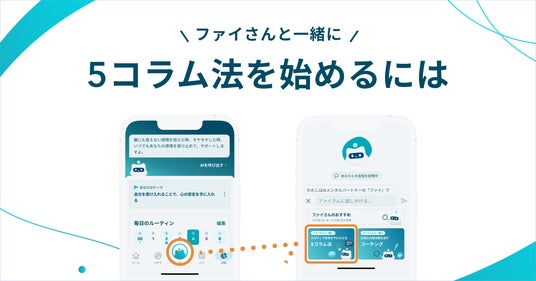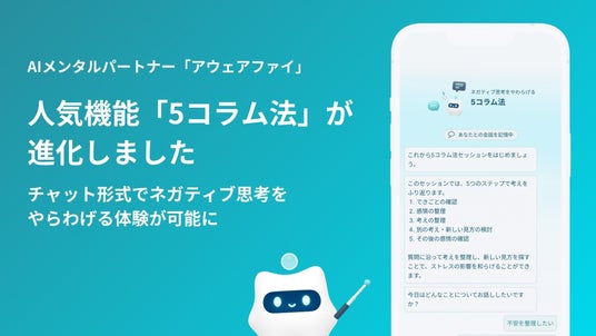 株式会社Awarefy(本社:東京都新宿区、代表取締役 CEO 小川 晋一郎、以下「アウェアファイ」)が提供するAIメンタルパートナーアプリ「アウェアファイ」において、人気機能「5コラム法」が進化し、ファイさんと一緒にお話しながらも体験できるようになりました。チャット形式でファイさんとお話していくだけでネガティブ思考をやわらげられ、悩みに対する新しい考え方が引き出されます。※従来の「5コラム法」機能も引き続きご利用いただけます。