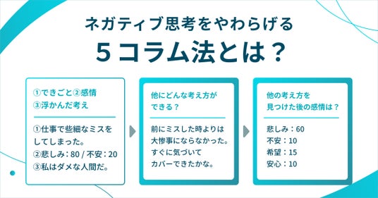 自分をつらくさせる「ネガティブな考え方のくせ」を和らげ、より柔軟な考えを取り入れることを目指す心理学のフレームワークです。 モヤモヤや不安を感じる出来事が起きたときの思考や感情を書き出して整理し、新しい考え方を見つけていきます。